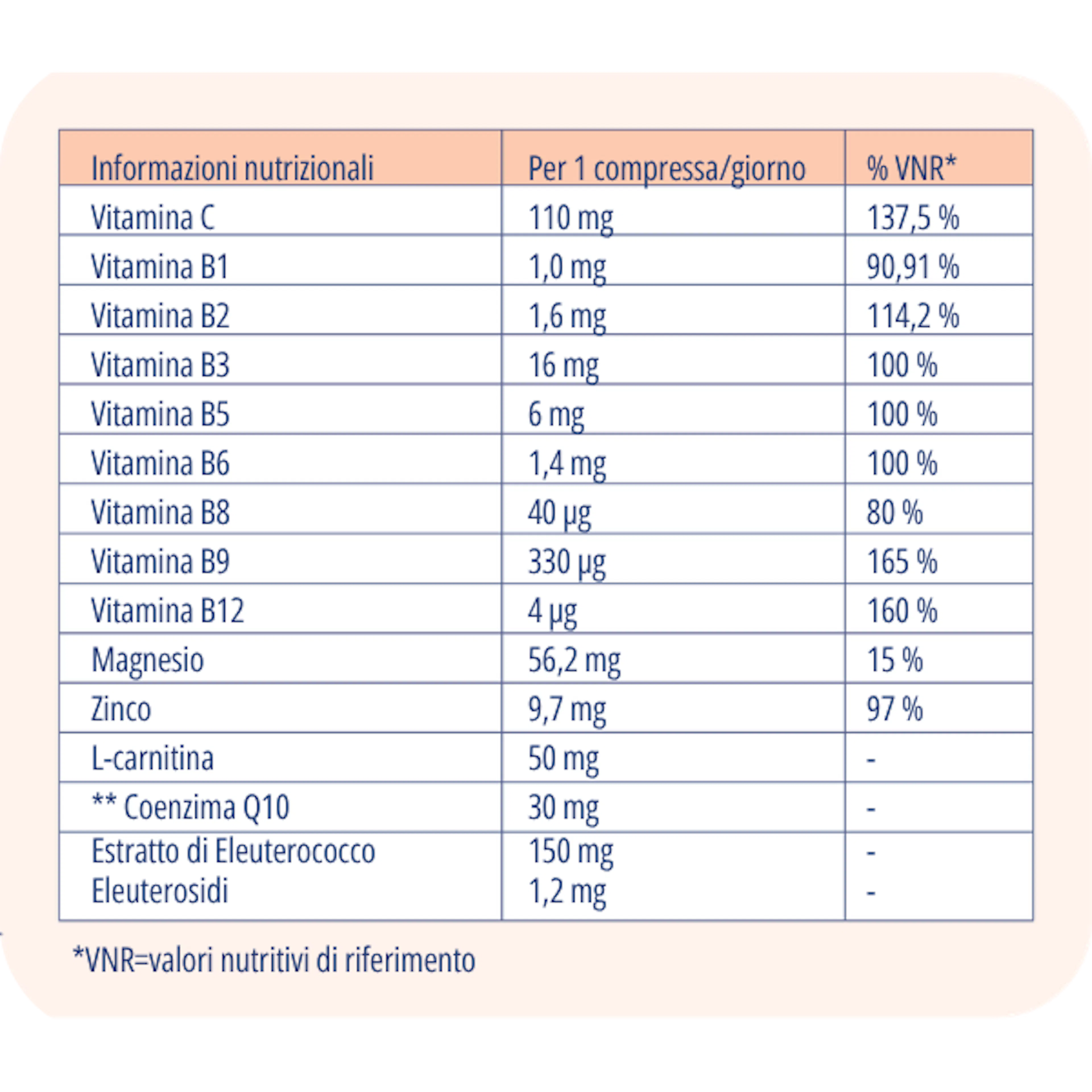 Integratore alimentare con edulcoranti per una ricarica di energia¹ e nutrienti, favorire la forma fisica¹ e mentale² e supportare l’organismo³ a base eleuterococco, vitamine, zinco, magnesio, coenzima Q10 e L-carnitina.