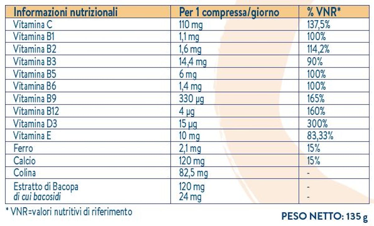 L-ascorbico (Vitamina C); estratto di foglie/steli di bacopa (Bacopa monnieri (L.) Wettst.); aroma naturale di arancia; colorante: rosso di barbabietola; acetato di DL-alfa-tocoferile (Vitamina E); pirofosfato di ferro; edulcorante: sucralosio; nicotinamide (Vitamina B3); D-pantotenato di calcio (Vitamina B5); colecalciferolo (Vitamina D3); cianocobalamina (Vitamina B12); cloridrato di piridossina (Vitamina B6); riboflavina (Vitamina B2); cloridrato di tiamina (Vitamina B1); acido folico (Vitamina B9).